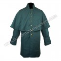 Budget line greatcoat is a single breasted 5 button front coat with a stand up collar and a 6 button elbow length cape. Civil War Blue wool with a brown cotton/White Cotton body lining that extends just below the waist.